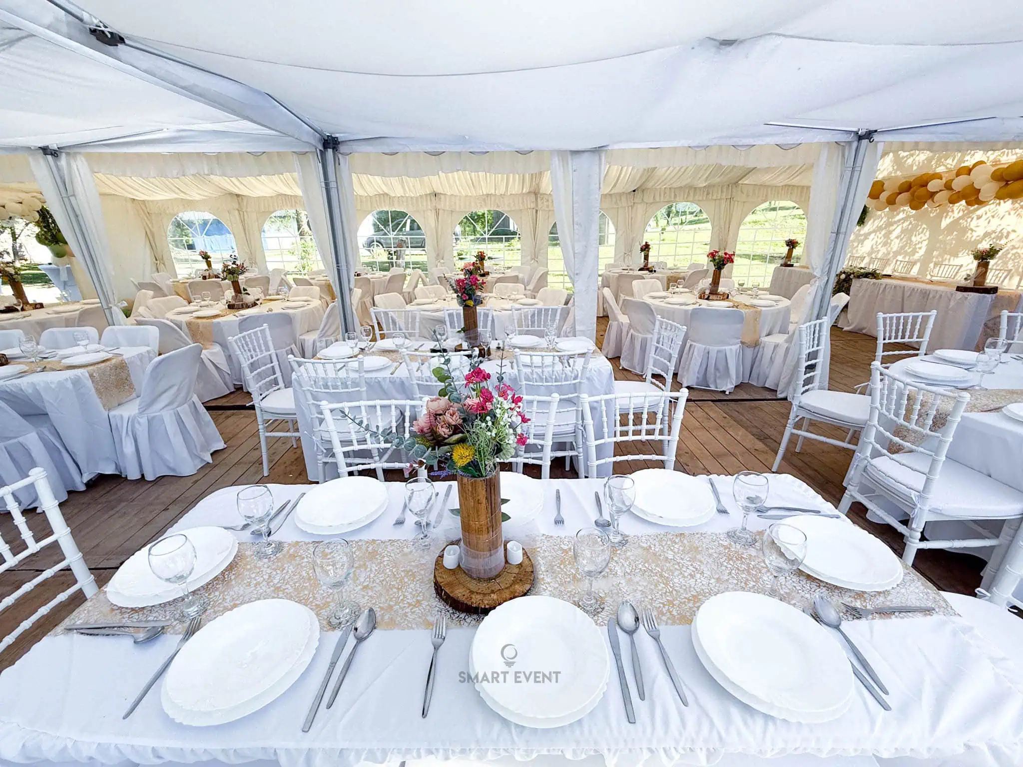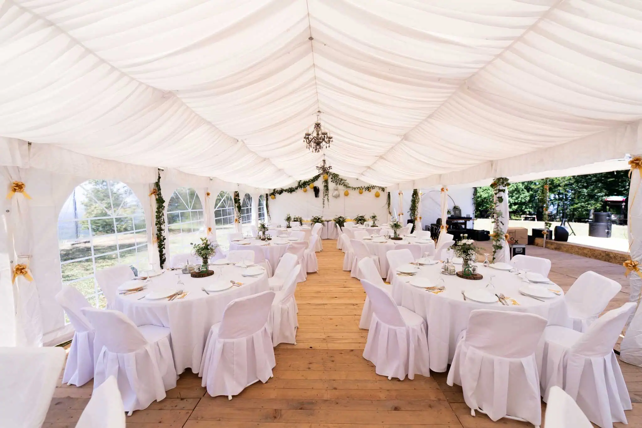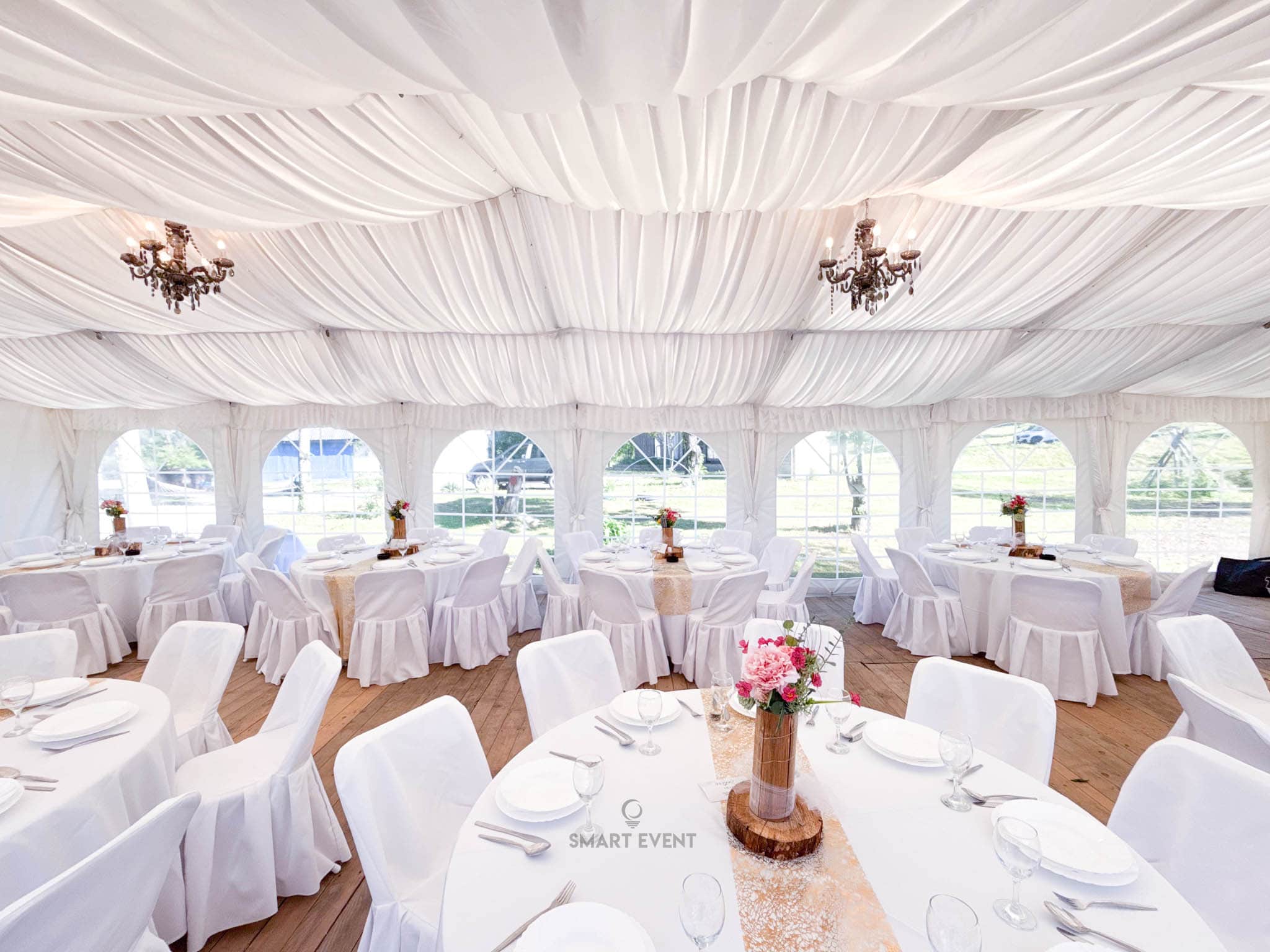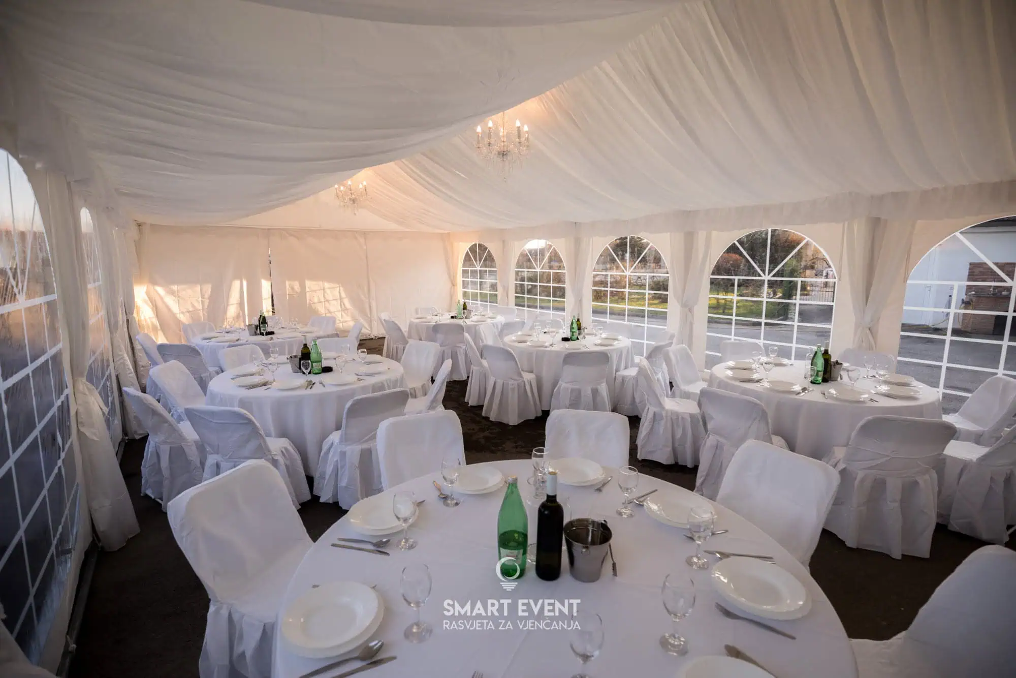 U ponudi imamo šatore različitih dimenzija, prilagođene broju gostiju i rasporedu prostora. Kapacitet ovisi o vrsti stolova (okrugli ili ravni) te potrebi za plesnim podijem.