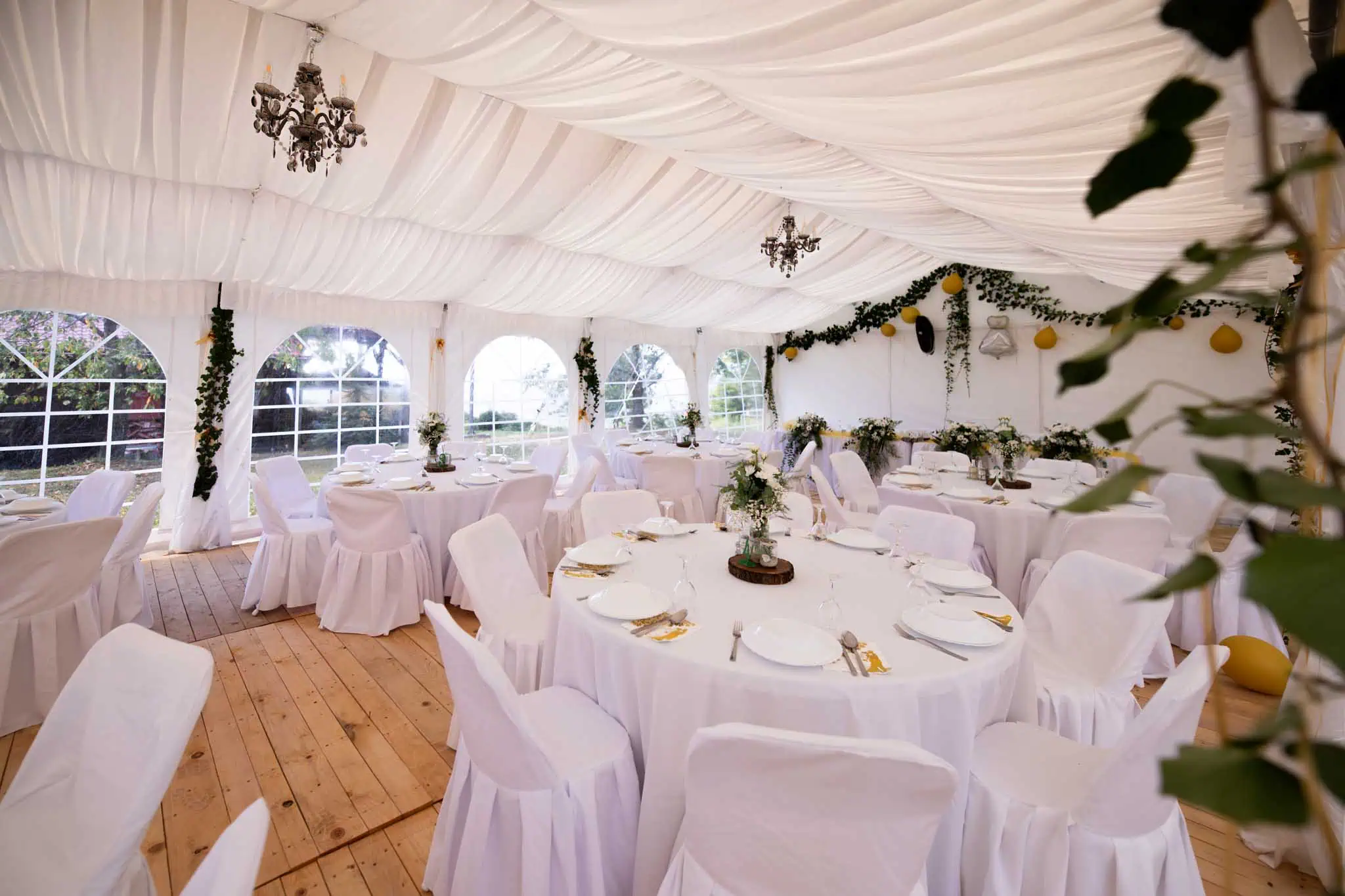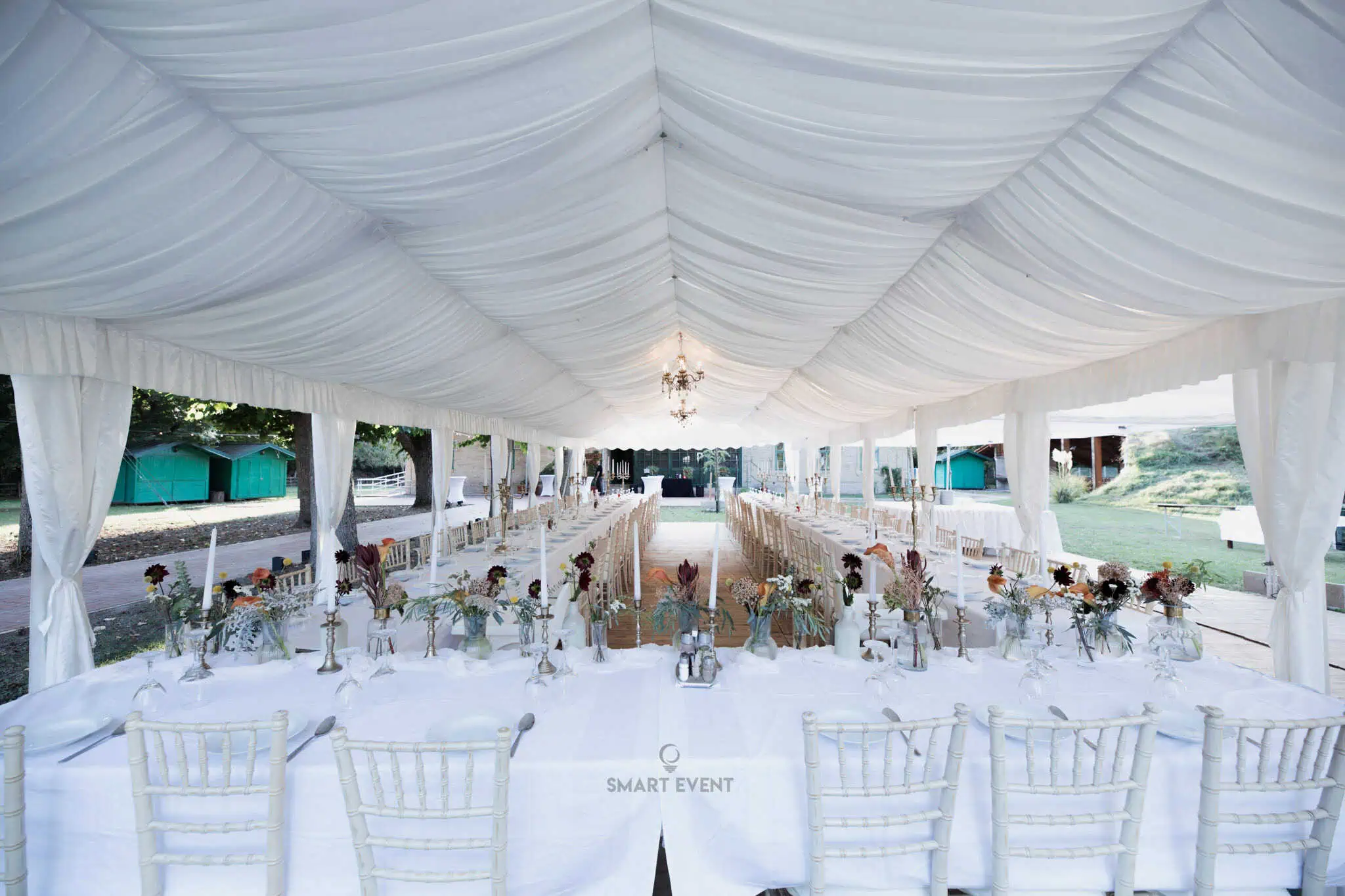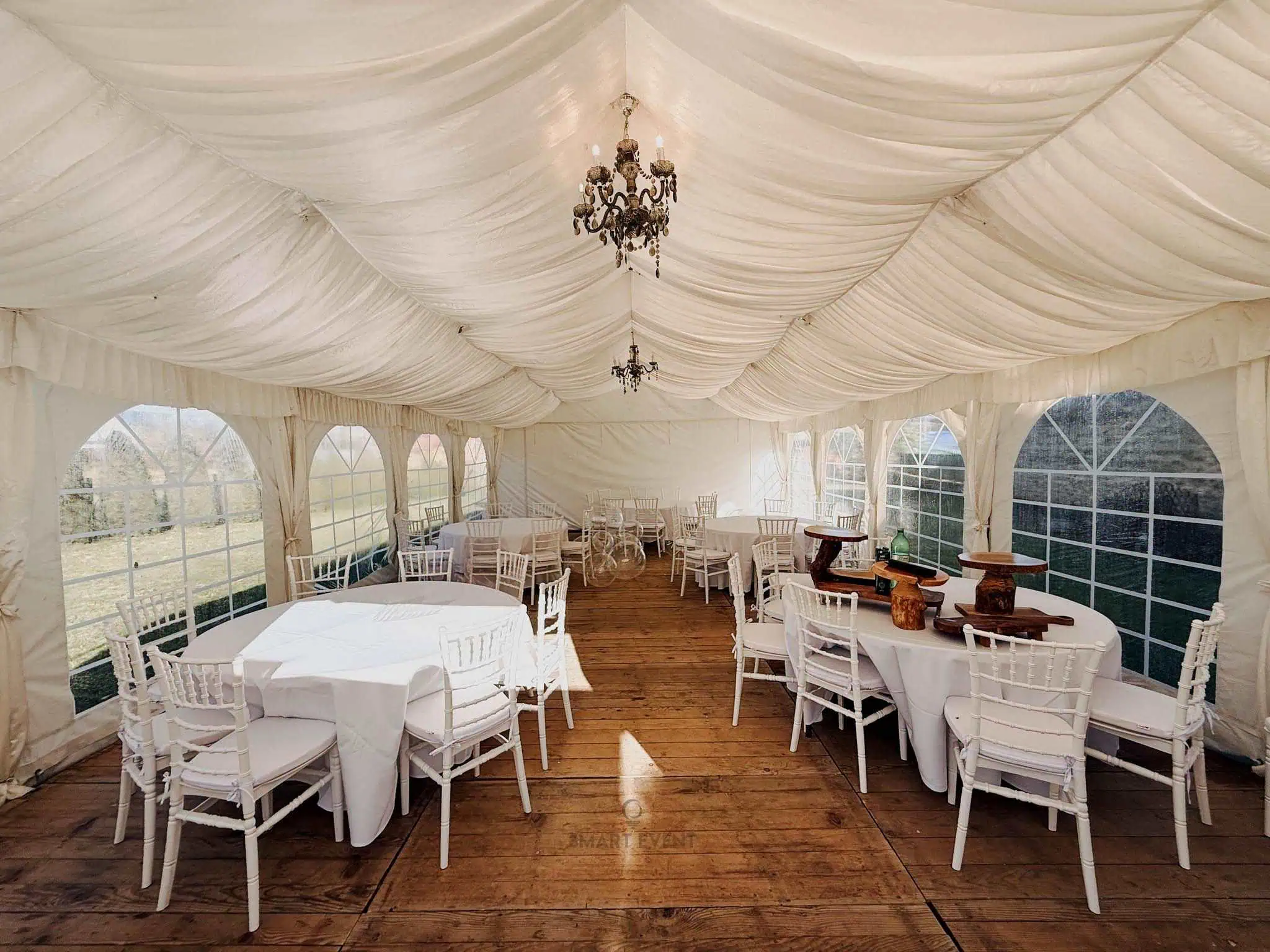 U ponudi imamo šatore različitih dimenzija, prilagođene broju gostiju i rasporedu prostora. Kapacitet ovisi o vrsti stolova (okrugli ili ravni) te potrebi za plesnim podijem.