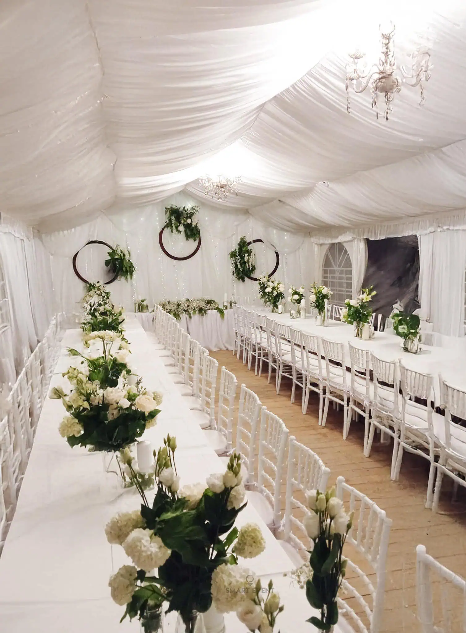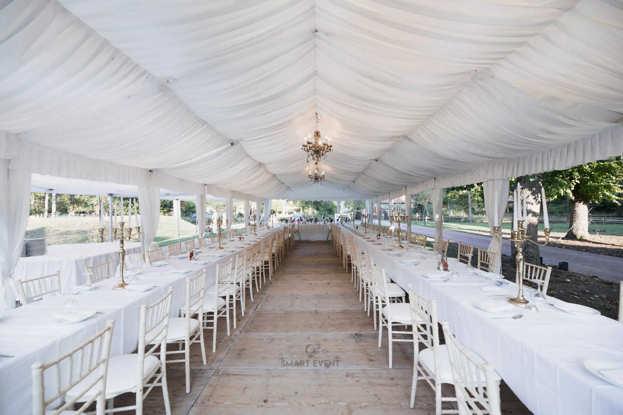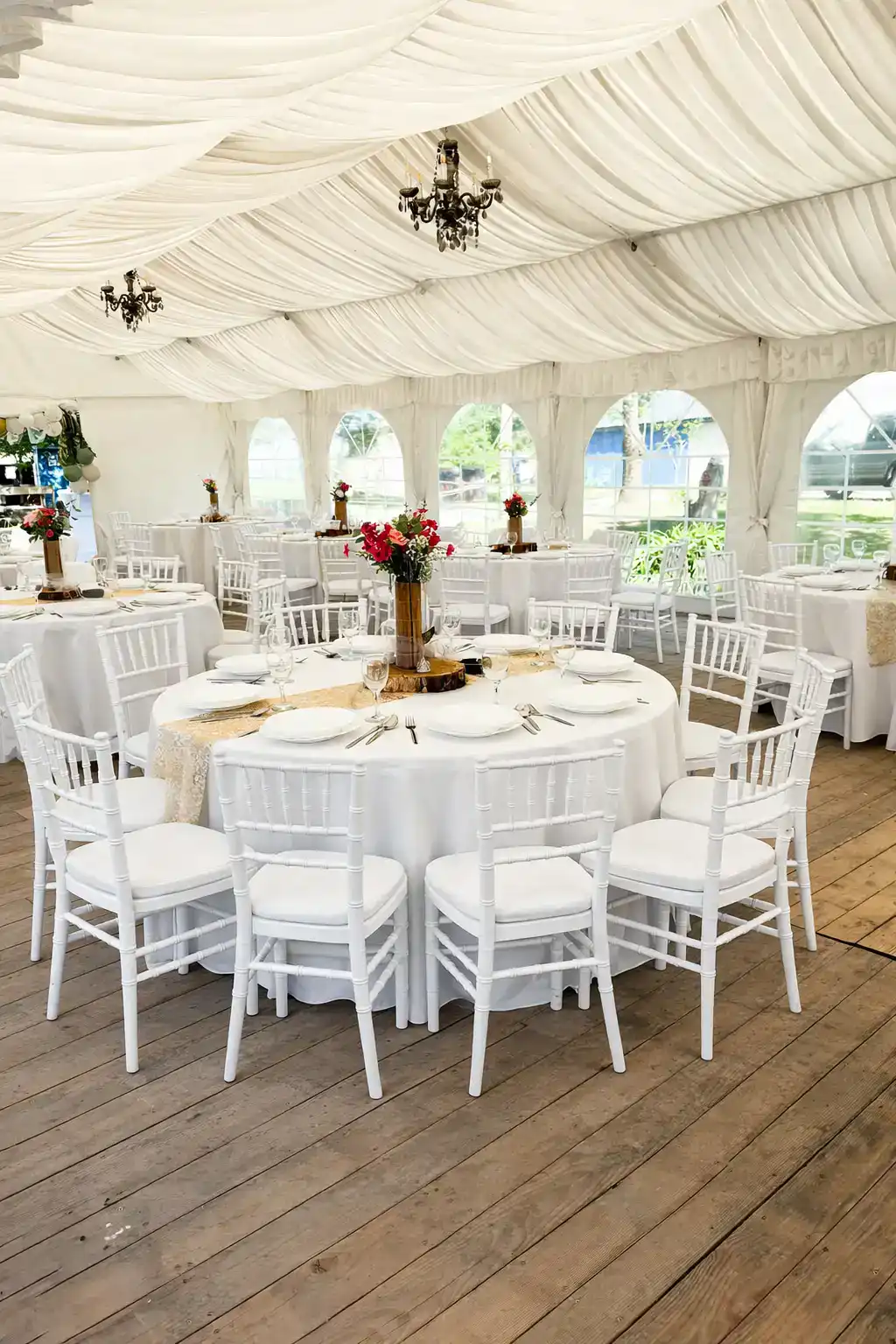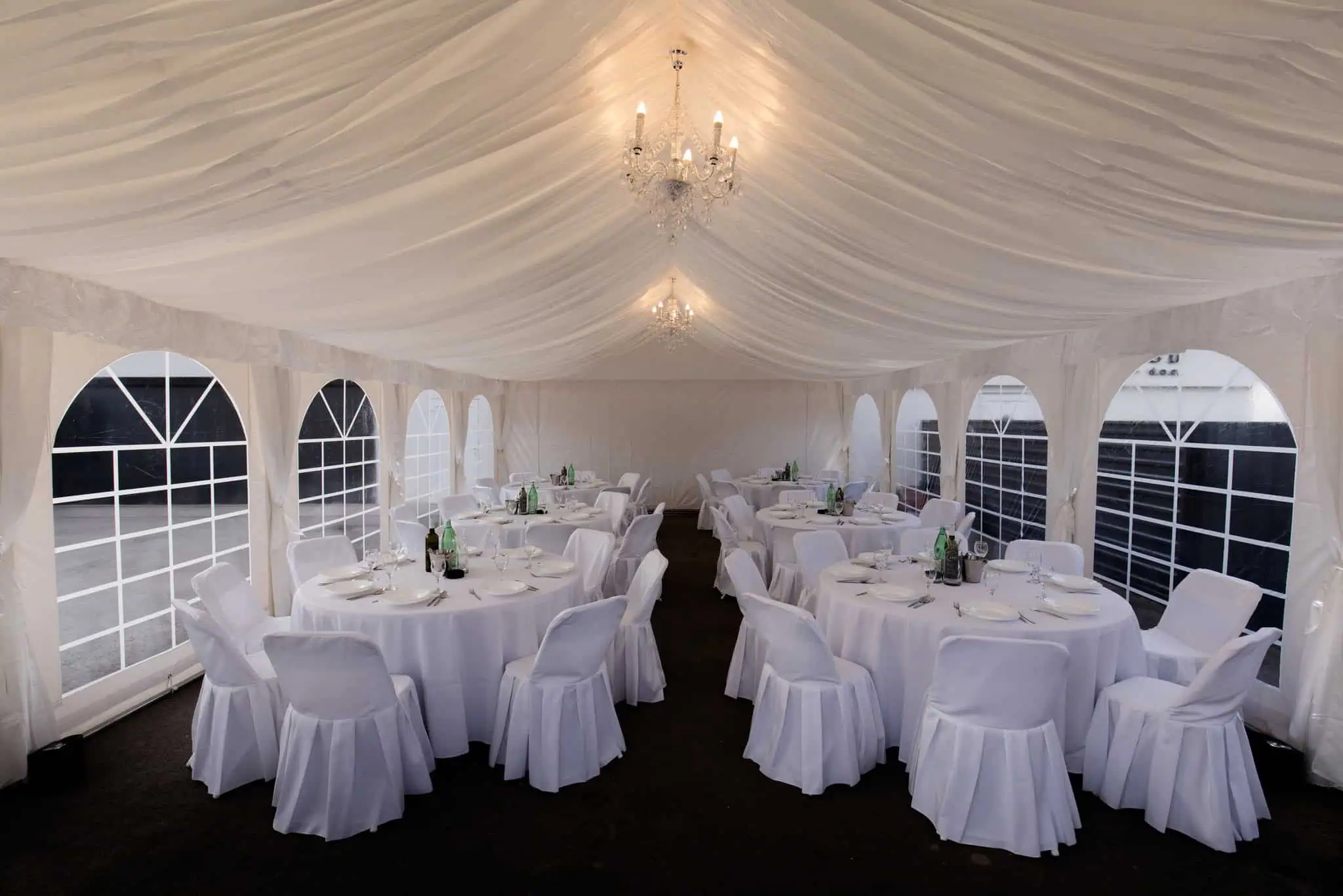 U ponudi imamo šatore različitih dimenzija, prilagođene broju gostiju i rasporedu prostora. Kapacitet ovisi o vrsti stolova (okrugli ili ravni) te potrebi za plesnim podijem.