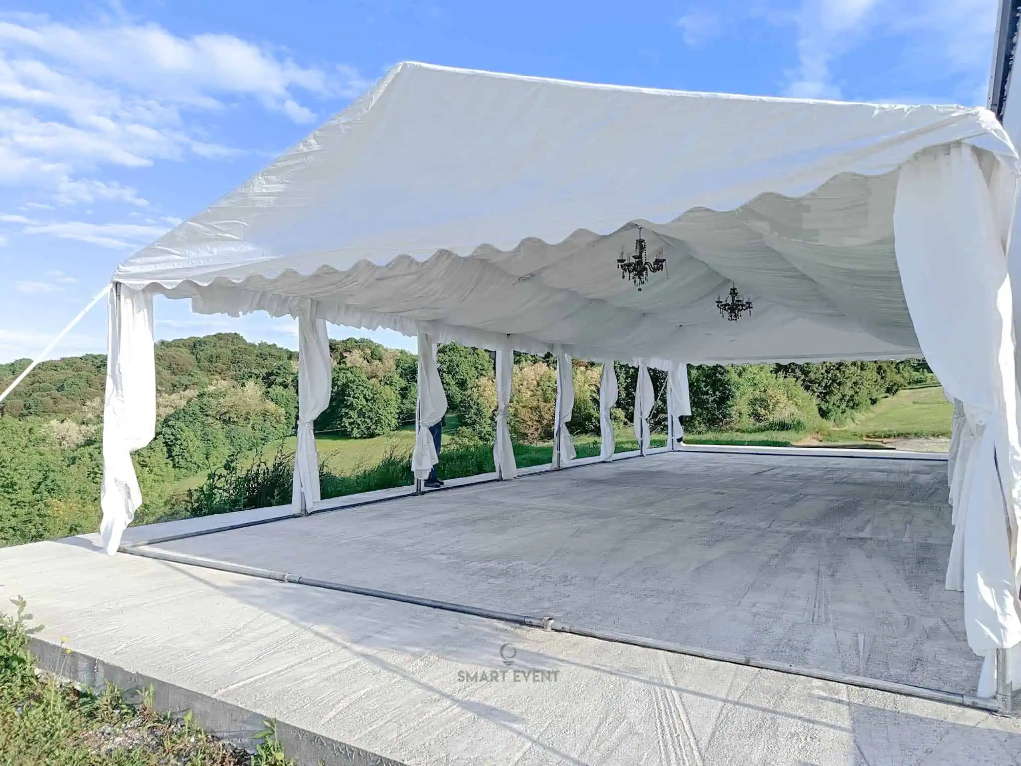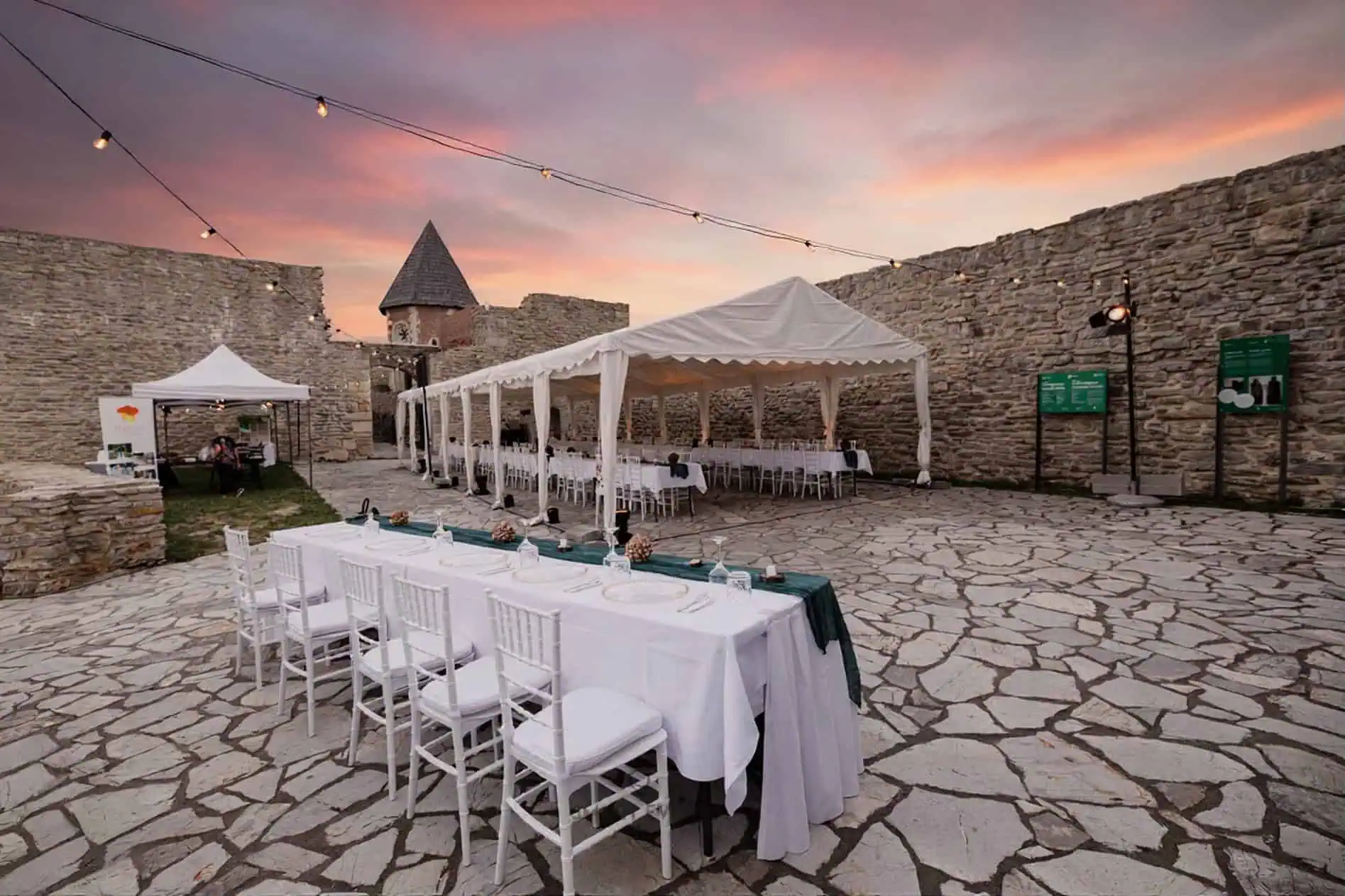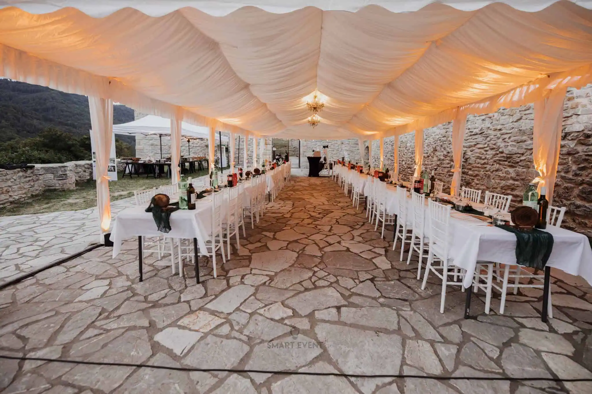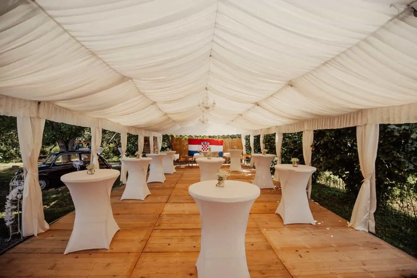 Svečani šatori s baldahinima idealni su za vjenčanja i formalne evente. Unutrašnjost šatora obložena je bijelim stropxnim tkaninama koje prostoru daju elegantan i profinjen izgled, uz mogućnost dodatnog osvjetljenja lusterima ili ambijentalnom rasvjetom.