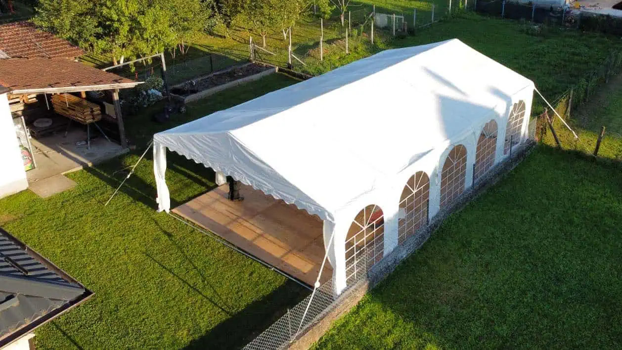 Veličina šatora ovisi o broju gostiju, vrsti stolova (okrugli ili ravni) i potrebi za plesnim podijem, šankom ili catering zonom. Nakon što dobijemo broj gostiju i okvirni raspored, preporučujemo optimalnu dimenziju.