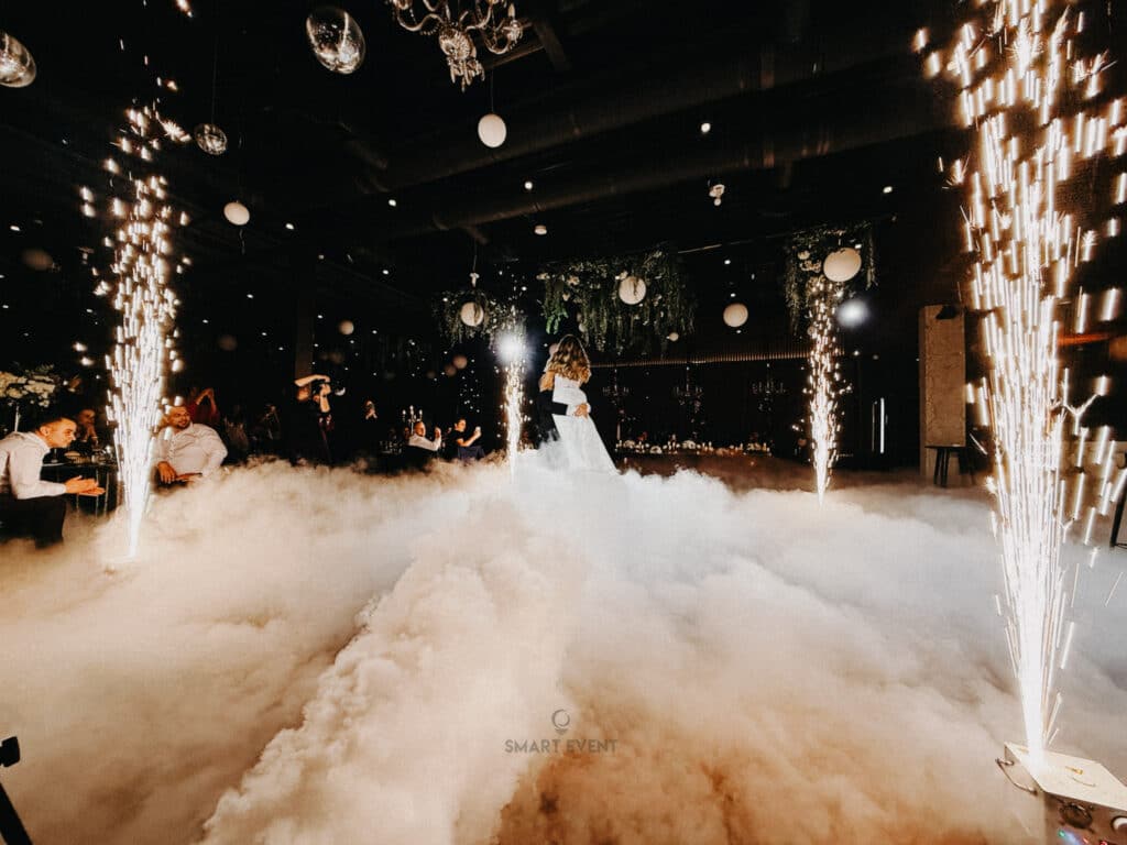 Za prvi ples mladenaca koristili smo profesionalni niski dim za vjenčanja, koji stvara efekt plesa na oblacima. Dim ostaje nisko uz pod i ne podiže se prema stropu, što omogućuje savršene fotografije i video snimke bez narušavanja prostora.